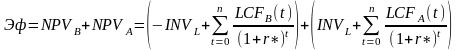 Чтобы определить в чем выражается экономический эффект арендного финансирования в сравнении с кредитом необходимо провести анализ конкурирующих инвестиций при всем разнообразии инвестиционных ситуаций с применением методов, основанных на концепции дисконтирования. Экономический эффект от финансирования аренды выражается в разнице сумм арендного и кредитного финансирования. Сумма эквивалентного аренде займа определяется путем дисконтирования потока арендной задолженности по скорректированной ставке кредитного финансирования. Чтобы оценить экономический эффект лизинга относительно прямого кредитного финансирования необходимо сложить значения чистой текущей стоимости арендного финансирования лизингодателя (NPVВ) и арендатора (NPVА).