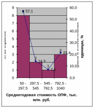 Рис. 3. Гистограмма распределение отраслей промышленности по среднегодовой стоимости ОПФ