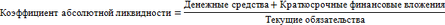 | 4 | Коэффициент абсолютной ликвидности = (стр.1+стр.2)/стр.3 | 0,02 | 0,03 | 0,01 |