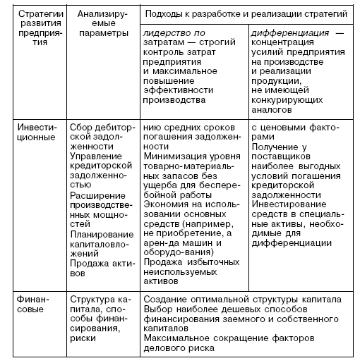 Главная цель реструктуризации — поиск источников развития предприятия (бизнеса) на основе внутренних и внешних факторов. Внутренние факторы основаны на выработке операционной, инвестиционной и финансовой стратегий, а внешние — на реорганизации видов деятельности и структуры предприятия. Стратегии развития предприятия и их воздействие на факторы его стоимости приведены в таблице 1 [6].