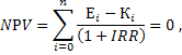 Внутренняя норма доходности (IRR) - это расчетная ставка процентов, при которой капитализация регулярно получаемого дохода дает сумму, равную начальным инвестициям, и, следовательно, они окупаются. Другими словами, внутренняя норма доходности - это мера прибыльности, то есть дисконтная ставка, при которой сегодняшняя стоимость денежных потоков равна начальным инвестициям. Для расчета этого показателя равенство: