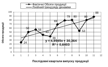 Рис. 1 Попередній аналіз динаміки фактичного поквартального обсягу продукції (стандартний регресійний аналіз в таблицях EXCEL-2000)