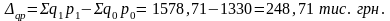 Висновок: Абсолютний приріст виручки від реалізованої продукції у звітному періоді порівняно з базисним за рахунок зміни фізичного обсягу продаж та цін складає 248,71 тис.грн.