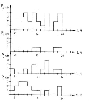 Рис. 1.1. Суточные графики электрических нагрузок подразделений объекта (цифры условные)