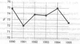 Однако из-за того, что вертикальная шкала графика начинается не с 0 %, как это следовало бы сделать, создается впечатление, что процент потребления электроэнергии в 1994 г. в 2,5 раз выше, чем в 1991 г. Действительные отношения процентов потребления электроэнергии по годам выясняются лишь тогда, когда шкала начинается от 0 и идет до 76 % [9]. Такая же ошибка допущена при построении графиков рис. 2.2, 2.3 [9, рис. 30; 31, с. 131]. Кроме того, на этих графиках отсутствует градуировка оси ординат, что приводит к еще большему искажению восприятия данных.
