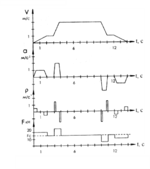 На рис. 1.2 представлены диаграммы скорости (семипериодная диаграмма), ускорения, рывка и тяговых усилий уравновешенной подъемной установки, которые достаточно полно характеризуют режим работы подъемного механизма и являются исходными данными для последующих расчетов (расчет мощности привода и др.).