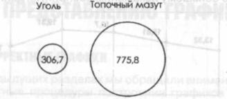 На другом примере (рис. 2.4) изображено сравнение объемов потребления в Хмельницкой области в 1990 г. угля и топочного мазута (тыс. т. у.т.). Диаметр каждого круга соответствует объемам потребления угля и топочного мазута. Объем потребления мазута, как это следует из сравнения диаметров двух кругов, больше в 2,5 раза потребления угля. Однако, глаз любого человека, охватывая площади кругов, воспринимает объем потребления указанного топлива неверно. Хотя диаметр большего круга равен только двум с половиной диаметрам меньшего круга, его площадь воспринимается в 6 раз больше площади меньшего круга. Геометрические фигуры могут внести путаницу при некорректном использовании их для изображения величин, в данном случае объем потребления топлива должен быть пропорционален площади круга, а не его радиусу.