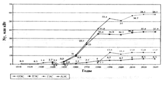 Рис. 2.11. Установленная мощность электростанций ОЭС Украины, млн. кВт (диаграмма динамики) [16, с. 43, диагр. 1]