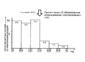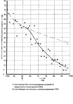 Рис. 2.9. Изменение количества несчастных случаев со смертельным исходом от поражения человека током в Австрии до и после введения закона об использовании УЗО (диаграмма динамики) [10, с. 40, рис. 5]