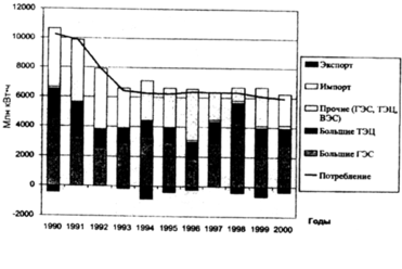 Рис. 2.19. Производство и потребление электроэнергии (вместе с потерями) в Латвии (диаграмма динамики) [4, с. 31, рис. 4]