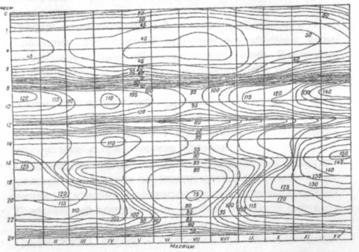 Рис. 2.21. Нагрузка электростанции по дням и часам года (универсальный график, цифры условные)