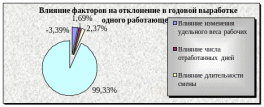 Просуммировав все показатели, получим отклонение в годовой выработке одного работающего. После выполненного анализа сделаем свод факторов и определим удельный вес влияния каждого фактора в общей сумме отклонений.