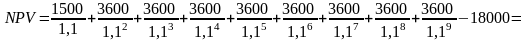 Величина необхідних інвестицій по проекті дорівнює 18 000 грн.; передбачувані доходи: у перший рік – 1 500 грн., в останні 8 років – по 3 600 грн. Визначите доцільність прийняття проекту за критерієм NPV, якщо вартість капіталу дорівнює 10 %.