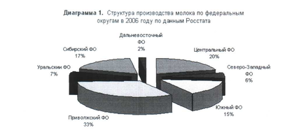 Из рисунка 11 видно, что структура производства молока в 2006 году в Сибирском ФО составило 17%, в Дальневосточном ФО -2%, в Центральном ФО – 20%, в Северо-Западном ФО – 6%, в Южном ФО – 15%, в Приволжском ФО- 33%, в Уральском ФО-7%.