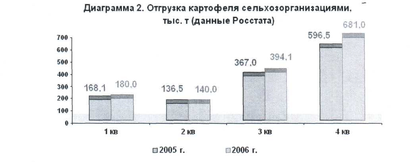 Из рисунка 7. видно, что отгрузка картофеля секльхозорганизациями за 2005 год составила 596,5 тыс. т., за 2006 год увеличилась и составила 681,0 тыс./т.