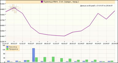 Мировой рынок пшеницы в период с 18 по 25 апреля был относительно стабилен, насытившись и переварив информацию о состоянии посевов и о погодных условиях в основных странах-производителях. Российский рынок зерна так же был спокоен. Никаких резких колебаний цены на нем не происходило. Разберем ситуацию, сложившуюся на российском рынке продовольственной пшеницы. Для этого рассмотрим графики, построенные на основе зарегистрированных лотов торговой площадки.