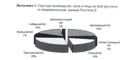Из рисунка 9 видно, что структура производства скота и птицы на убой в Сибирском ФО составило 16%, в Дальневосточном ФО -2%, в Центральном ФО – 23%, в Северо-Западном ФО – 5%, в Южном ФО – 19%, в Приволжском ФО- 28%, в Уральском ФО-7%.