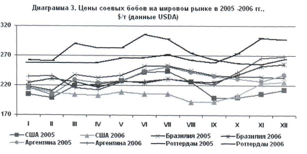 Из рисунка 6 видно, что Цены соевых бобов на мировом рынке за 2006 год составила 320 долл/т.