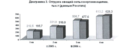 Из рисунка 8. видно, что отгрузка овощей секльхозорганизациями за 2005 год составила 613,2тыс. т., за 2006 год увеличилась и составила 628,3 тыс./т.