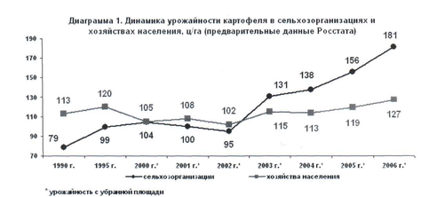 Из рисунка 6. видно, что динамика урожайности картофеля сельхозорганизациях и хозяйствах населения за 2006 год составила 181 ц/га и 127 ц/га соответственно, в 2005 году - 156 ц/га и 119 ц/га соответственно, в 2004 году 138 ц/га и 1113 ц/га соответственно.