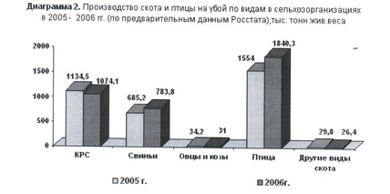Из рисунка 10 видно, что производство скота и птицы на убой по видам: КРС в 2005 году-1134,5 тыс. тонн жив. Веса, в 2006 году 1074,1 тыс. тонн жив. веса; свиньи в 2005 году-685,2 тыс. тонн жив. веса, в 2006 году 783,8 тыс. тонн жив. веса; овцы и козы в 2005 году-34,2 тыс. тонн жив. веса, в 2006 году 31,0 тыс. тонн жив. веса; птица в 2005 году-1554,0 тыс. тонн жив. веса, в 2006 году 1840,3 тыс. тонн жив. веса; другие виды скота в 2005 году-29,8 тыс. тонн жив. веса, в 2006 году 26,4 тыс. тонн жив. веса.