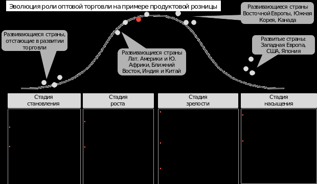 В своем развитии сектор оптовой торговли проходит несколько стадий развития. В настоящее время российский сектор оптовой торговли также как и розница находится на стадии роста. Ожидается, что с развитием сектора розничной торговли и производства, розничные и производственные компании, укрупняясь, будут развивать собственные подразделения, занимающиеся дистрибуцией. При этом компании оптового сектора будут либо интегрироваться в розницу, либо фокусироваться на логистических услугах, работе с малыми компаниями (производственными и розничными), нишевым ассортиментом или удаленными территориями.