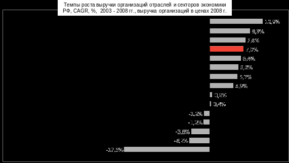 С 2003 по 2008 годы выручка организаций отрасли торговли, без учёта индивидуальных предпринимателей, демонстрировала один из самых высоких темпов роста, который составил 7%, уступая только сектору строительства, сектору производства и распределению электроэнергии, газа и воды и обрабатывающим производствам, темпы роста которых составили 10,9%, 8,3% 7,4%.