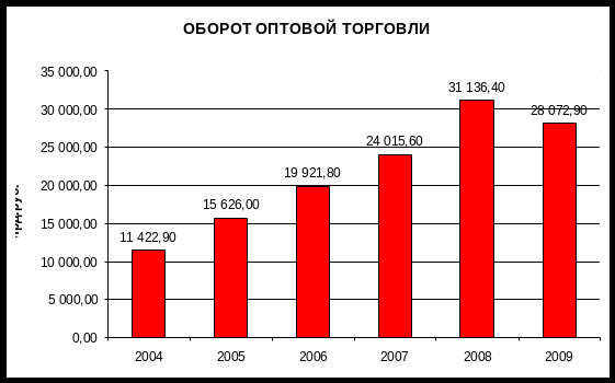 Анализ таблицы 2 и рисунка 3 показывает стремительный рост объемов оборота оптовой торговли, который достиг в 2008 г. 31 136 млрд. руб., так, в 2008 году по отношению к 2004 году его рост составил 172,8 %., равномерно ежегодно увеличиваясь на протяжении 5 лет в среднем на 25%, но после начавшегося кризиса постигшего РФ в 2008 году, к 2009 году показатели снизились на 9,8% и составили 28 072 млр. руб.
