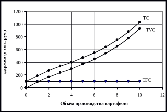 | Совокупный продукт (Q), в ед. | Совокупные постоянные издержки (TFC), в тыс. руб. | Совокупные переменные издержки (TVC), в тыс. руб. | Общие издержки (TC = TFC + TVC), в тыс. руб. |