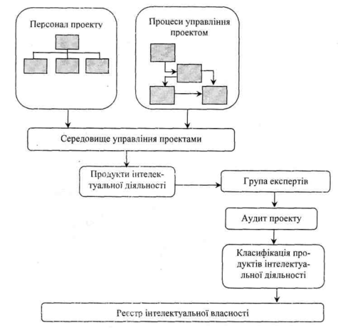генерування ідей - процес інтелектуальної діяльності людини; ідентифікації ПІД - визначення на якому етапі життєвого циклу проекту з'являються продукти інтелектуальної діяльності, а також визначення, що саме є цінними результатами інтелектуальної діяльності з загальної маси напрацювань в процесі реалізації проекту; - класифікації ПІД - визначення, до якого типу об'єктів відносяться продукти інтелектуальної діяльності учасників проекту; експертизи інтелектуальної власності, яка може бути кількох видів: експертиза об'єкта права ІВ, який планується використовувати в процесі реалізації проекту, експертиза об'єкта, який отримують в якості результату проекту з перспективою надання йому статусу ОПІВ та експертиза продуктів інтелектуальної діяльності в проекті. Для проведення експертизи необхідно сформувати систему критеріїв оцінки;