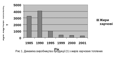 У 2001 році виробництво продукції з жирів харчових топлених склало 7,78% рівня 1985 року, і 10,6% рівня 2000. На протязі даних шести років середньорічний темп росту фізичного об’єму виробництва продукції з жирів харчових топлених склав 92,3%.
