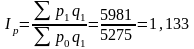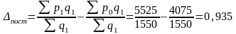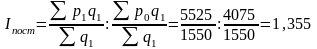 - индекс цен постоянного состава показывает, что цена литра молока увеличилась на 35,5 % или на 0,935 руб. за счёт изменения цен на каждом рынке.
