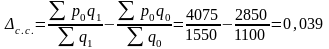 - индекс влияния изменения структуры объема продаж молока на динамику сред ней цены показывает, что цена литра молока увеличилась на 1,5 % или на 0,039 руб. за счёт изменения товарооборота на отдельных рынках.