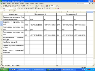 Данные расчеты осуществляются по двум предприятиям (А и Б) для базисного периода, для условий роста и снижения выручки от реализации.