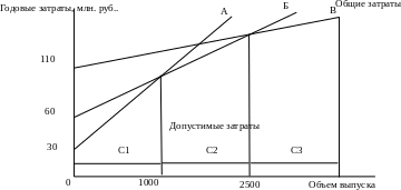 Карта пересечений показывает также, что при объеме выпуска менее 1000 единиц в год для размещения производства станет предпочтительнее пункт 1, а при объеме выпуска более 2500 единиц в год - пункт 3. Для этих случаев точки пересечений на графе 1000 и 2500 по оси абсцисс.