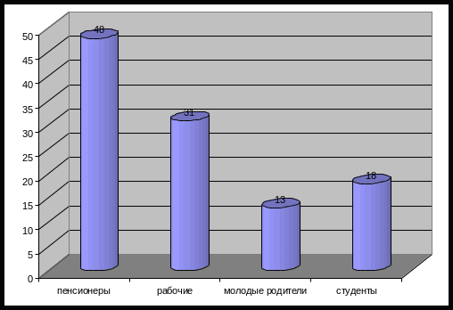 Именно на данных слоях населения и строился маркетинговый опрос. Потребителями почтовых услуг данного отделения являются пенсионеры (48 % населения), рабочие (31 %), молодые родители (13 %) и студенты (18%).