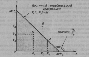 Бюджетное ограничение определяют доступный потребительский ассортимент или все имеющиеся в наличии наборы товаров. Иначе сказать, любой набор товаров X и Y доступен, если они имеются в наличии. Доступный потребительский ассортимент представлен на рис., где количество товаров X и Y отражаются на осях координат.