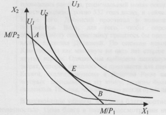 Именно для этой кривой бюджетная линия будет являться касательной в точке Е. Потребитель тратит весь свой бюджет в точках А, В и Е. Но только в точке Е он достигает максимально возможной полезности, так как точки А и В принадлежат кривой безразличия более низкого уровня