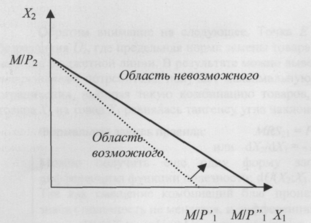 возможного и невозможного. Бюджет позволяет приобрести те комбинации товаров, которые лежат в области возможного -- левее и ниже бюджетной линии. Те же комбинации, которые лежат выше и правее, потребителю недоступны. Так как деньги являются универсальным товаром-посредником, они обеспечивают замещение одного товара другим в пропорциях, определяемых рыночными ценами. Заметим, что эти пропорции не имеют никакого отношения к предпочтениям и вкусам потребителя. Нужно обратить внимание еще на один важный момент в балансе доходов и расходов потребителя в левой части записана абсолютная величина его доходов - номинальный доход. Однако граница бюджетного ограничения задана реальным доходом Номинальный доход - сумма денежных единиц, получаемая в данный период. Реальный доход - количество благ, которое потребитель может приобрести, потратив весь свой номинальный доход.