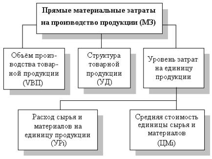 Как правило, наибольший удельный вес в себестоимости промышленной продукции занимают затраты на сырьё и материалы. Система факторов, оказывающих влияние на прямые материальные затраты, приведена на рис.12.