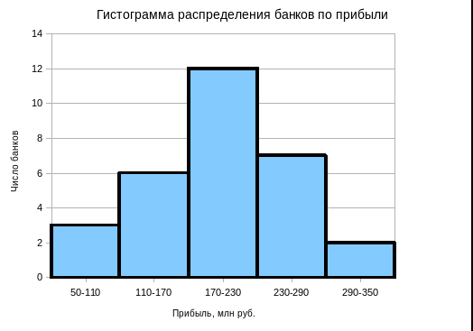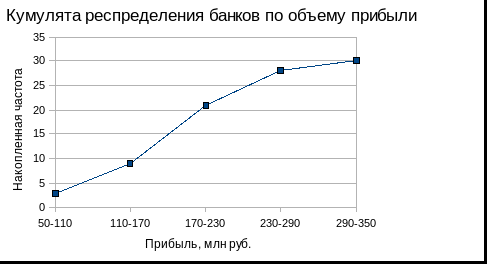 Вывод. Анализ статистического ряда распределения изучаемой совокупности банков показывает, что распределение банков по объему прибыли не является равномерным: преобладают банки с прибылью от 170 млн руб. до 230 млн руб. (это 12 банков, доля которых составляет 40%); 30% банков имеют прибыль менее 170 млн руб., а 70% – менее 230 млн руб.