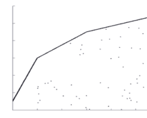По оси Y на рисунке отложен интегральный показатель эффективности деятельности предприятий, по оси X - интегральный показатель стоимости затраченных ими ресурсов. Каждому предприятию соответствует точка на плоскости. Ломаная линия - эффективная граница, на которой располагаются предприятия с максимальной эффективностью, равной 1.