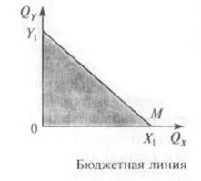 Бюджетное пространство представляет собой всю доступную потребителю область выбора. На рисунке это заштрихованный треугольник, ограниченный бюджетной линией и осями координат. Линия бюджетного ограничения в самом простом случае описывается уравнением
