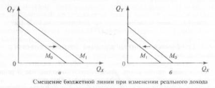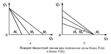 2. Расположение бюджетной линии зависит от величины денежного дохода. Увеличение денежного дохода потребителя при неизменных ценах приводит к параллельному перемещению бюджетной линии вправо (рисунок а). Уменьшение денежного дохода потребителя при неизменных ценах приводит к параллельному перемещению бюджетной линии влево (рисунок б). Изменение дохода потребителя не меняет угла наклона бюджетной линии, но меняет координаты точек пересечения бюджетной линии с осями координат.
