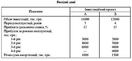 Показник внутрішньої норми дохідності у розрахунках характеризує рівень дохідності конкретного інвестиційного проекту (у відсотках) у формі дисконтної ставки в розмірах, за яких майбутній обсяг грошового потоку приводиться до теперішньої вартості вкладених інвестицій. Іншими словами, внутрішню норму дохідності можна охарактеризувати як дисконтну ставку, за якої чистий приведений дохід у процесі дисконтування дорівнюватиме нулю. Внутрішню норму дохідності як показник використовують здебільшого для порівняльного оцінювання ефективності інвестицій. Порівнюючи два і більше проекти, можна вибрати варіант, який забезпечує найвищий рівень дохідності. Розглянемо на прикладі методику розрахунку ефективності інвестицій, використовуючи умовні дані. Вихідні дані для розрахунку інвестиційних проектів А і Б наведено в табл.26.