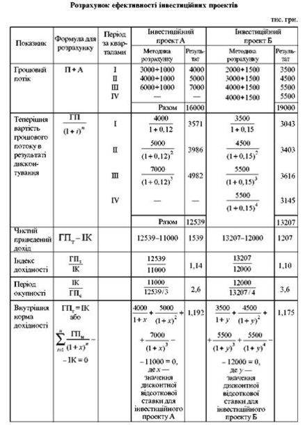 Підбиваючи підсумок проведеного аналізу, констатуємо, що інвестиційний проект А вигідніший, ефективніший як за розміром чистого приведеного доходу й індексу дохідності, так і за періодом окупності. Цей варіант має більший запас щодо норми дохідності.