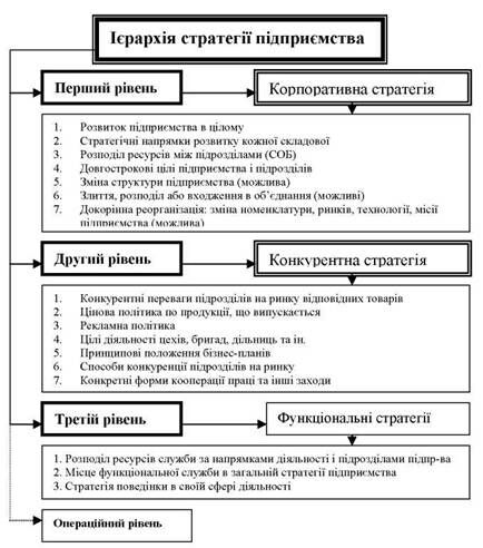 Ієрархія стратегій означає ранжування, взаємозв'язок і підпорядкованість різних стратегій, які становлять стратегію підприємства.