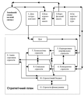 Складнішу схему формування стратегічного плану підприємства запропонував І. Ансофф (рис. 3). Організація розробки стратегії підприємства передбачає відбір кадрів розробників, організацію їх роботи і контроль, зміну організаційної структури управління відповідно до потреб стратегічного менеджменту, розвитку в кадрів стратегічних здібностей та інформаційно-аналітичного забезпечення процесу розробки стратегії.