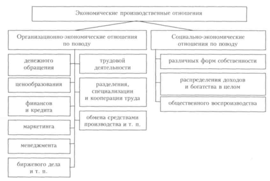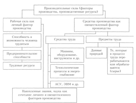 Средства производства подразделяют на предметы и средства труда. Первые охватывают предметы, данные природой, и те, которые в процессе труда перерабатываются или обрабатываются с целью получения готовой продукции для личного или производственного использования. Ко вторым принадлежат, во-первых, машины, оборудование, инструменты и другие технические орудия; во-вторых, технологические процессы и энергоснабжение; в-третьих, автоматизированные системы управления (АСУ), электронно-вычислительные машины (ЭВМ) и др. Центральное место в системе средств труда занимают накопленные человечеством знания. Человек живет в мире ограниченных возможностей. Ограничены его физические и интеллектуальные способности, время, которое он может уделить тому или иному занятию, средства, которые могут быть использованы для достижения поставленной цели. Ограниченность наличных ресурсов была и является главным и достаточно жестким условием, которое наслаивается объективной реальностью на размеры и возможности роста личного и общественного богатства. Однако это касается конкретного человека и конкретных условий существования общества. Что же касается развития общества в целом в исторической перспективе, то возможности человека неограниченны. На протяжении многовековой истории человек существенно раздвинул рамки приведенных и других ограничений. Однако перед индивидуумом, как и перед обществом в целом, всегда на каждом этапе встает проблема выбора направлений и способов использования ограниченных ресурсов. Ее можно решать разными методами, лежащими в плоскости экономики. Серьезной проблемой является не только производство, но и распределение его продуктов между различными слоями населения. Производственные ресурсы (труд, средства производства, особенно земля) ограничены, поскольку потребности людей постоянно растут. Ограниченность ресурсов и производимых на их основе благ порождает институт собственности, ибо собственник ресурсов и благ становится хозяином жизни. Отсюда необходимо эффективно использовать землю, ее недра, сырье, средства труда и труд людей. Поэтому остро стоит проблема рационального использования ограниченных ресурсов, которая решается на основе выбора наиболее эффективного роста производства. Если экономическое развитие осуществляется на неизменной технологической основе, вступает в действие закон убывающей производительности производства. Относительное и абсолютное сокращение производственных ресурсов общества при постоянном росте потребностей стимулирует развитие техники и технологии. Изменения в технологической основе общества ведут к изменениям в экономических взаимосвязях в производстве, в экономических производственных отношениях. В свою очередь изменившиеся экономические производственные отношения открывают простор для развития факторов производства, производственных ресурсов, что нейтрализует действие закона убывающей производительности факторов производства на основе закона соответствия экономических производственных отношений характеру и уровню развития производительных сил. Совокупность экономических производственных отношений в широком понимании представлена технико-экономическими, организационно-экономическими и социально-экономическими отношениями. Собственн