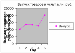 Наблюдается ежегодное увеличение выпуска товаров и услуг. Особенно сильный скачок произошел с 4 по 5 годы. Но в среднем уровни ряда ежегодно возрастали на 19%. Также наблюдаются переломы тенденции.